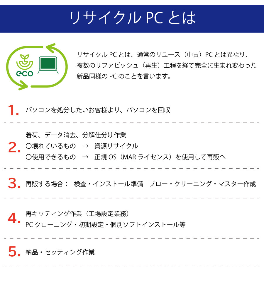 ※返品について リサイクルPCとは、通常のリユース(中古)PCとは異なり、 複数のリファビッシュ(再生)工程を経て完全に生まれ変わった 新品同様のPCのことを言います。