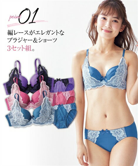 ブラジャー ショーツ セット 大きいサイズ レディース リフトアップ ストラップ付 編レース 3セット組 G85_LL-3L〜I100_4L-5L ニッセン nissen