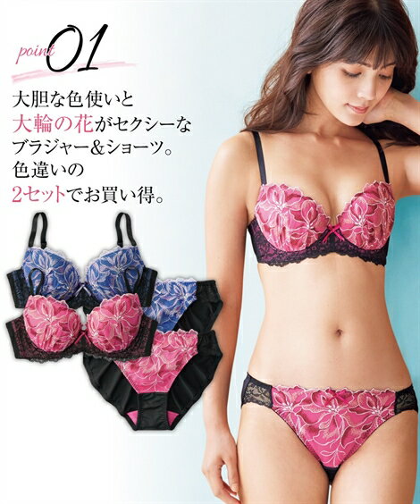 ブラジャー ショーツ セット 大きいサイズ レディース 大人 淑女 2セット組 華やか ゆり柄 パッションピンク系+ロイヤルブルー系 G85_LL-3L〜I100_4L-5L ニッセン nissen