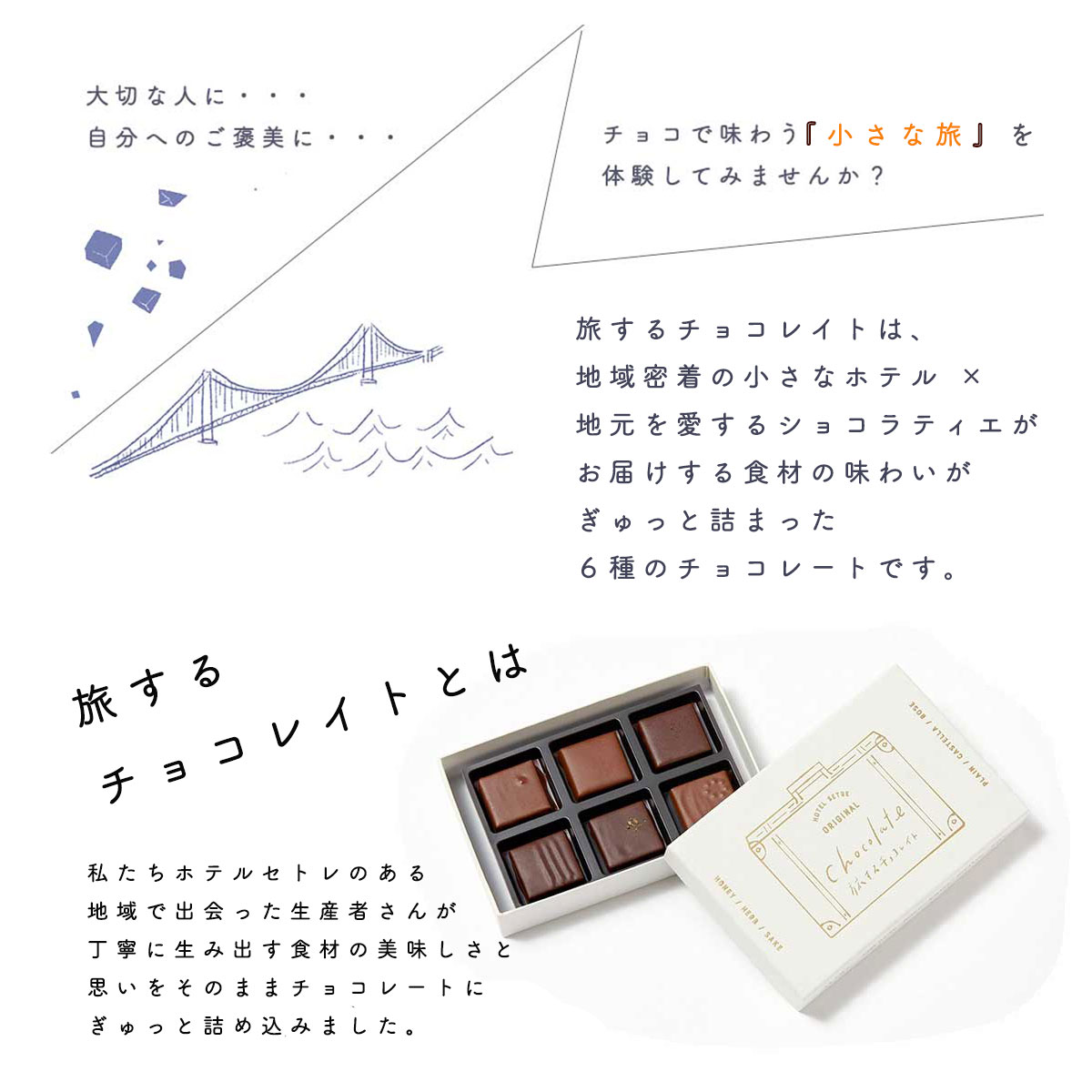 ・食材の味わいを通してその地域を旅する様な気持ちになればと旅するチョコレイトと名付けた、日本でも珍しいこだわりのご当地チョコレートです。