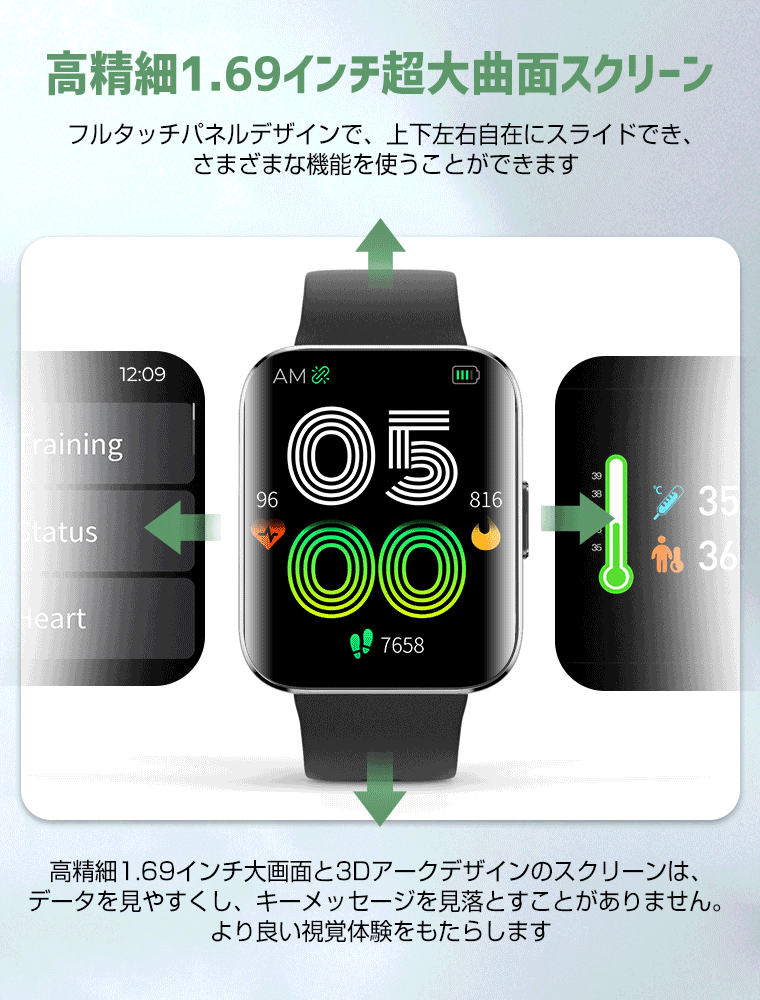 【二つバンド付き】 スマートウォッチ 1.69インチ大画面 レディース メンズ スマートウォッチ 24時間体表面温度測定 健康管理 IP67防水 スマートブレスレット 日本語表示 LINE対応 着信通知 おしゃれ プレゼント 敬老の日