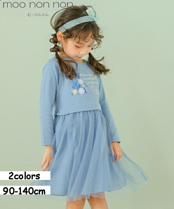 子供服 女の子 長袖 普段着 通学着 お出かけ着 ロゴ刺繍お花ドレスモチーフつきチュールドッキングワンピース ピンク ブルー 秋冬 90cm 100cm 110cm 120cm 2歳 3歳 4歳 5歳 6歳 7歳 8歳 【むーのんのん moononnon】